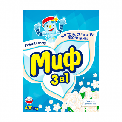 Стиральный порошок "Миф" предназначен для стирки в стиральных машинах любого типа. Стиральный порошок содержит комплекс элементов, благодаря которым белье после стирки становится чистым и свежим. Эффективно отстирывает различные пятна, а специальные отбеливатели, входящие в состав стирального порошка, сохраняют яркие цвета вещей. Стиральный порошок отлично отстирывает даже в холодной воде, потому что содержит специальные энзимы, которые начинают работать уже при низких температурах.