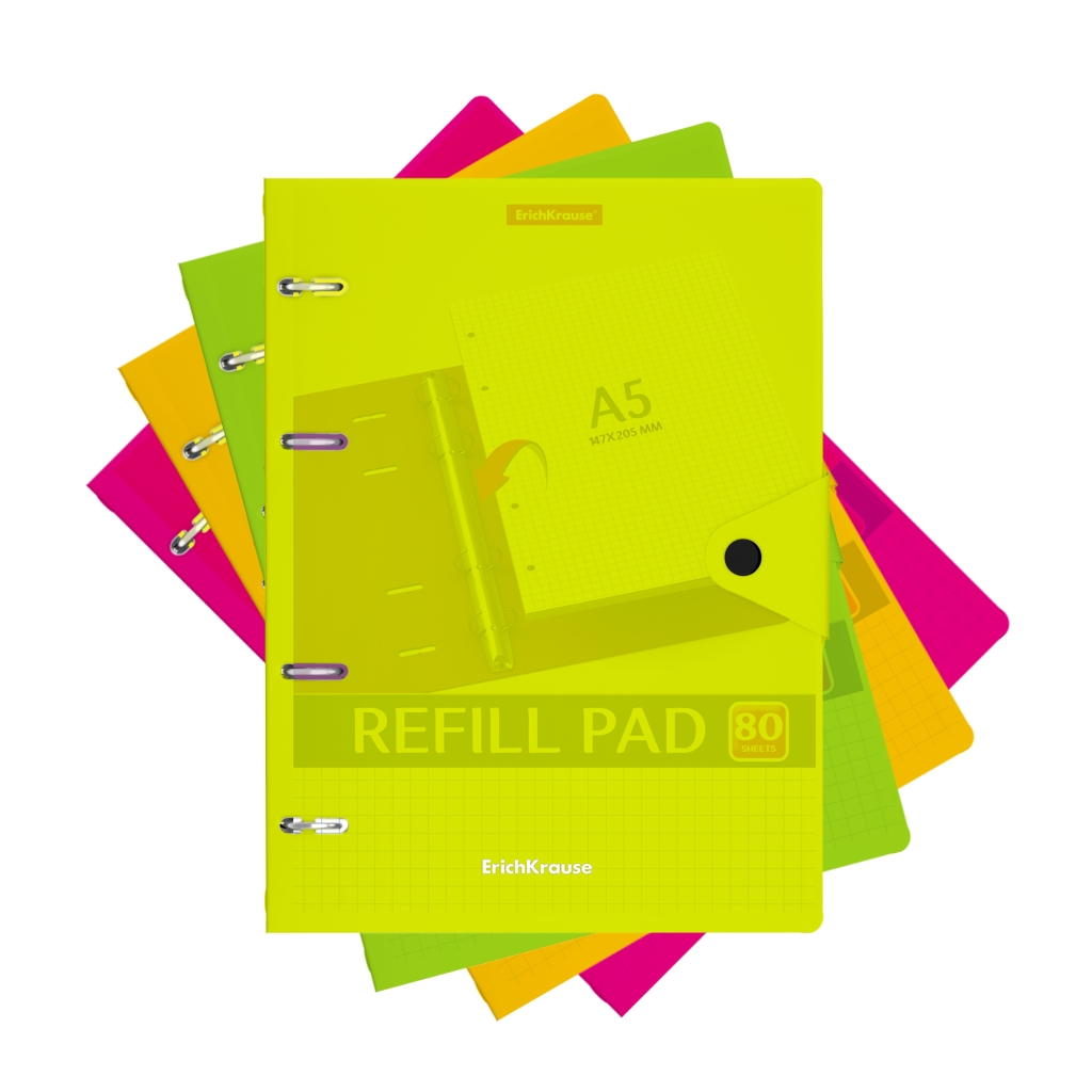 Тетрадь общая формата А5 (147x205 мм). Обложка из высококачественного износостойкого матового пластика с фактурой «песок». Яркие неоновые цвета обложки. В блоке 80 листов в клетку. Бумага офсетная плотностью 55 г/м2. Цвет линовки - синий. Скругленные уголки обложки. Тип скрепления - кольца. Обложка фиксируется клапаном с кнопкой. Прорези под кольца оснащены фиксаторами. Товар поставляется в нескольких вариантах цвета без возможности выбора.
