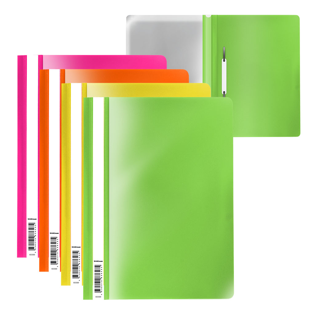 Папка-скоросшиватель пластиковая формата А4 из высококачественного пластика с текстурой поверхности "апельсиновая корка", на которой не видно отпечатков пальцев и мелких царапин. Предназначена для быстрого сшивания, хранения и просмотра документов. Цвет папки – ассорти: желтый, зеленый, оранжевый, розовый. Механизм - механический скоросшиватель; прозрачный верхний лист; усиленный пластиковый корешок с прозрачной полосой для информационной карточки Папка вмещает до 130 бумажных листов. Размер - 312х230 мм, толщина верхнего листа - 0.12 мм, толщина нижнего листа - 0.16 мм.