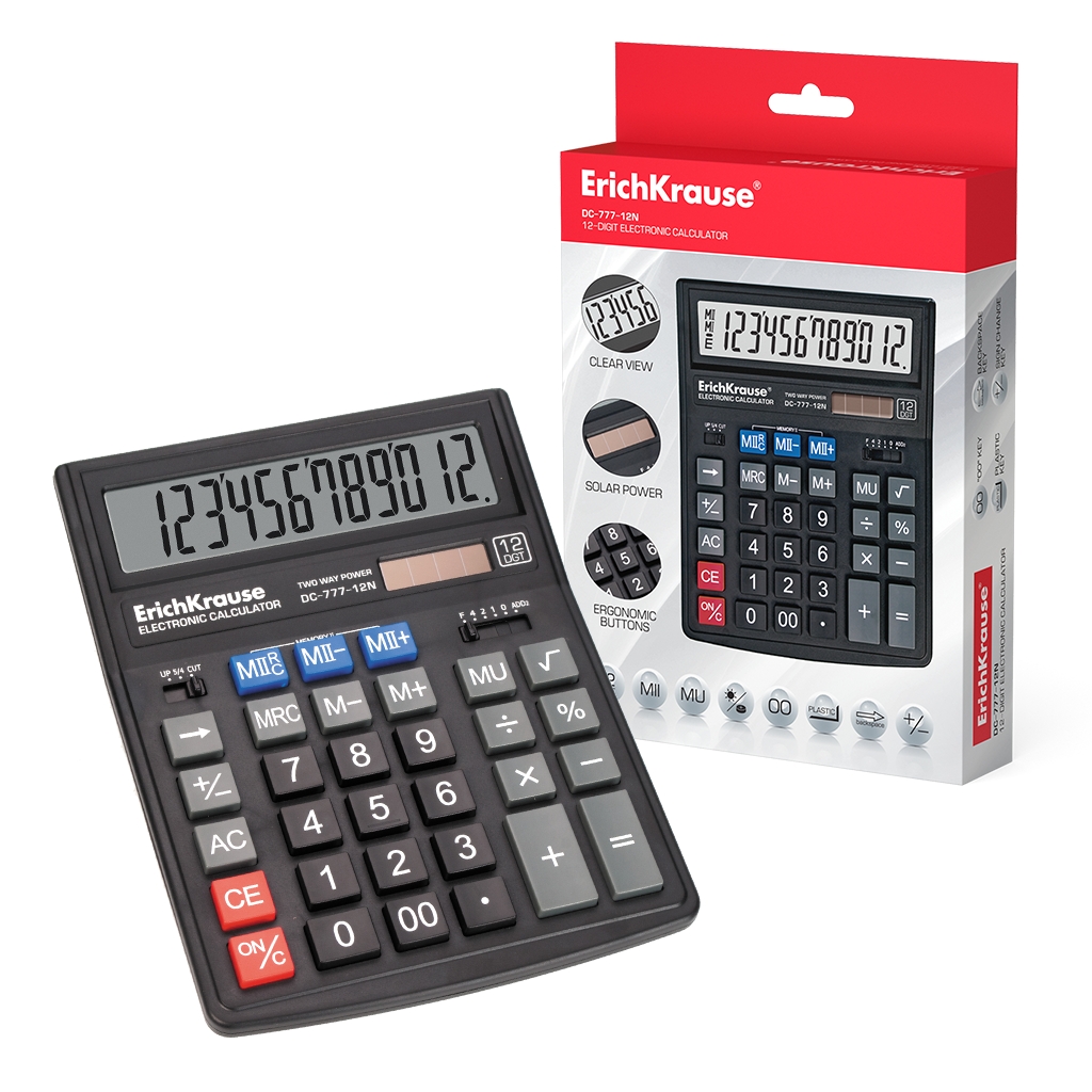 Бухгалтерский калькулятор в пластиковом корпусе с 12-разрядным ЖК - дисплеем. Имеет двухуровневую память. Оптимальный набор вычислительных функций позволяет совершать основные математические операции, рассчитывать проценты, наценку, извлекать квадратный корень, суммировать произведенные операции и запоминать промежуточный результат. Удобная клавиатура снабжена кнопками двойного нуля и удаления последней отображаемой цифры. Наличие двух переключателей: режима округления и количества знаков после запятой. Для экономии энергии предусмотрены два источника питания: солнечная и алкалиновая батарея, а также функция автоматического выключения.