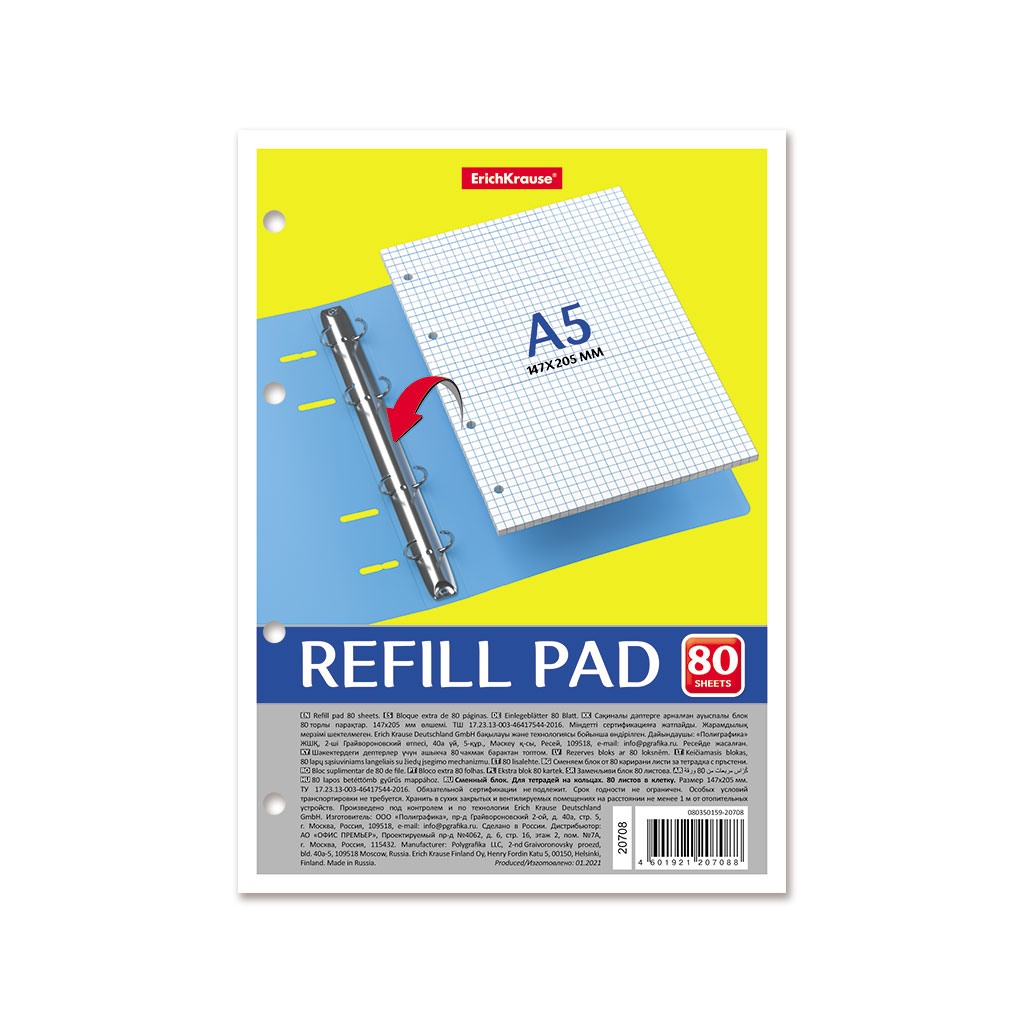 Сменный блок для тетрадей на кольцах формата А5 (147х205 мм). Благодаря плотной верхней обложке блок не деформируется. 80 листов в клетку. Бумага офсетная плотностью 60 г/м2. Цвет линовки - синий. Перфорация под кольца. Имеет индивидуальную упаковку в термоусадочную пленку.