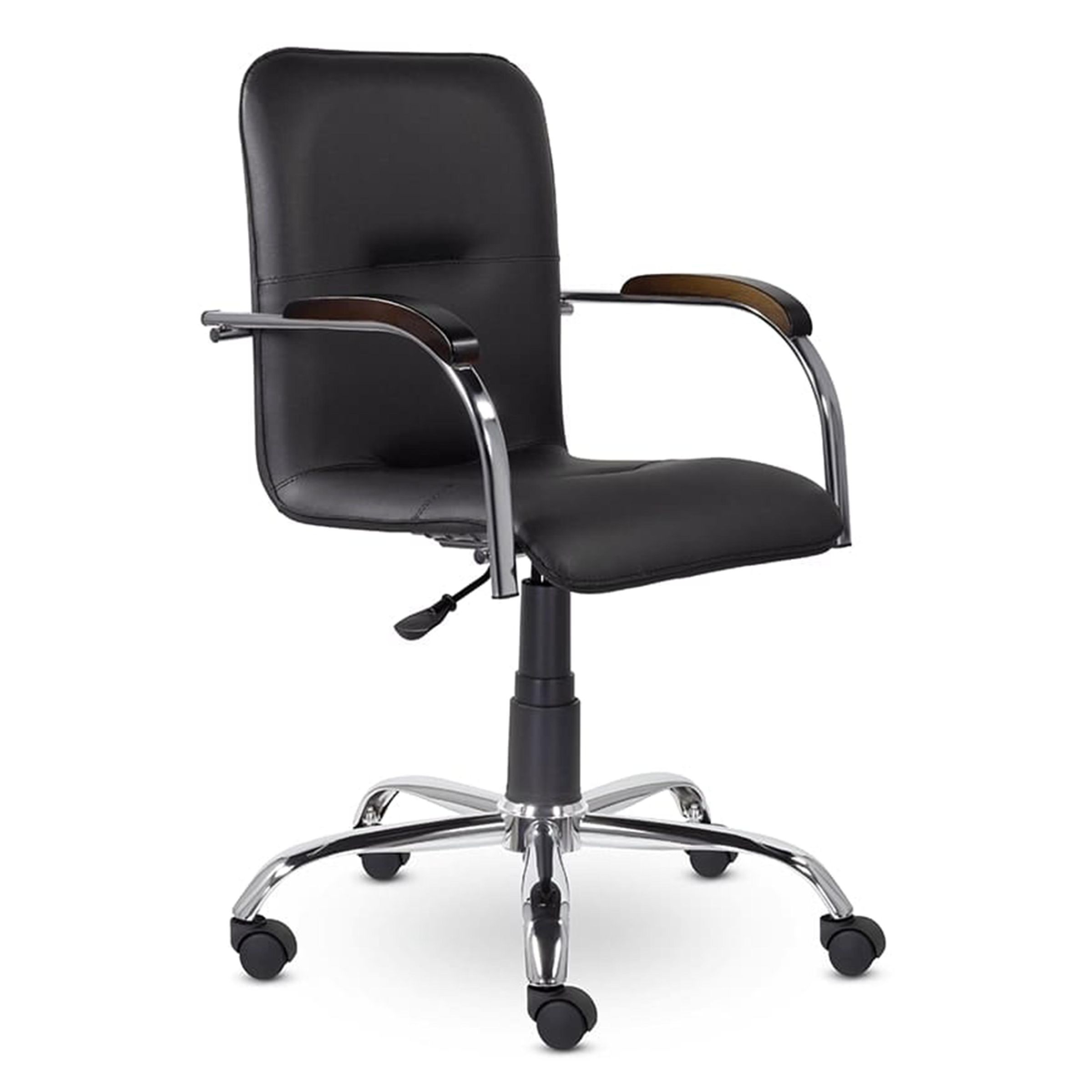 Классическое кресло изготовлено из износостойкой искусственной кожи и прочного металла. Удобное посадочное место и наличие подлокотников создают максимальный комфорт.