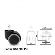 Крепление: разжимное кольцо. Материалы: полиамидный пластик. Основные размеры: Диаметр колеса: 50 мм. Ширина протектора: 8 мм. Ширина ролика: 54 мм. Металлический стержень: 11х20 мм. Диаметр шейки: 38 мм. Общая высота: 60 мм