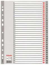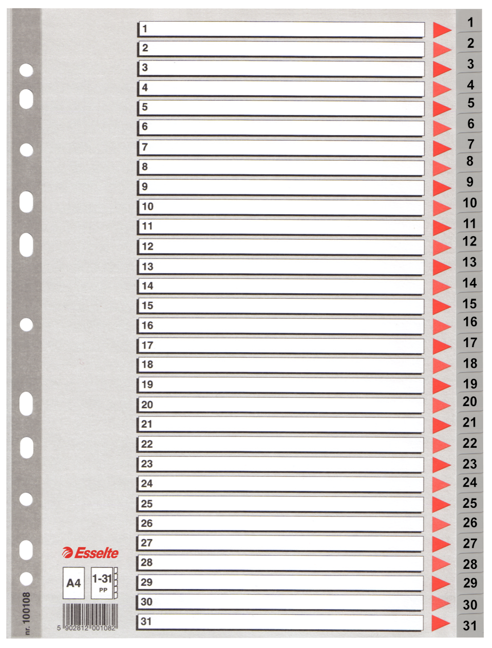 Разделители серого цвета. Большое поле на титульном листе для записи сведений о содержании рубрик. Прочная перфорированная полоска на титульном листе. 31 табуляторов, пронумерованных 1-31 для облегчения поиска нужных документов. Универсальная мультиперфорация (11 отверстий). Формат А4. ПП 0,12 мм